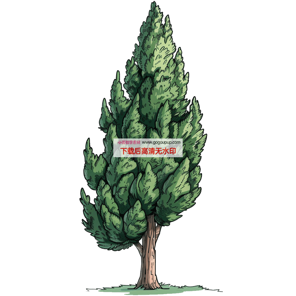 这是一幅风格简洁的植物主题手绘插画,描绘了一株挺拔的常绿乔木。作品采用绝对中心构图,将树木置于纯白背景中央,通过极简处理最大化突出主体的形态特征。树木造型精准呈现植物学特征:浅棕色树干的纹理线条清晰自然,层叠的深绿色针叶以尖塔形结构向上生长,体现典型的柏科植物形态。