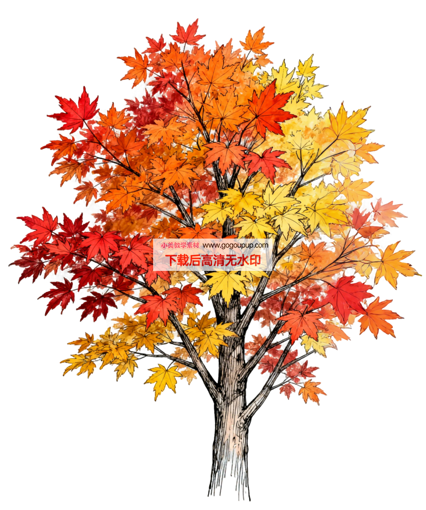 这是一幅充满秋日诗意的手绘风格枫树插画。作品采用绝对中心构图,将一棵枝繁叶茂的枫树置于纯白背景中央,最大化突出主体的季节特征与自然美感。枫树造型生动细腻:深褐色树干的纹理线条清晰自然,呈现树木的苍劲质感;繁茂的枝叶以红、橙、黄三色交织渐变,精准捕捉秋季枫叶的色彩变化规律,叶片形态自然舒展。技法上运用手绘笔触勾勒轮廓,通过水彩感的色彩过渡呈现秋叶的斑斓效果。色彩策略采用高饱和度暖色调(红/橙/黄)与纯白背景的极致对比,整体营造出浓郁秋意、温暖静谧的视觉氛围。