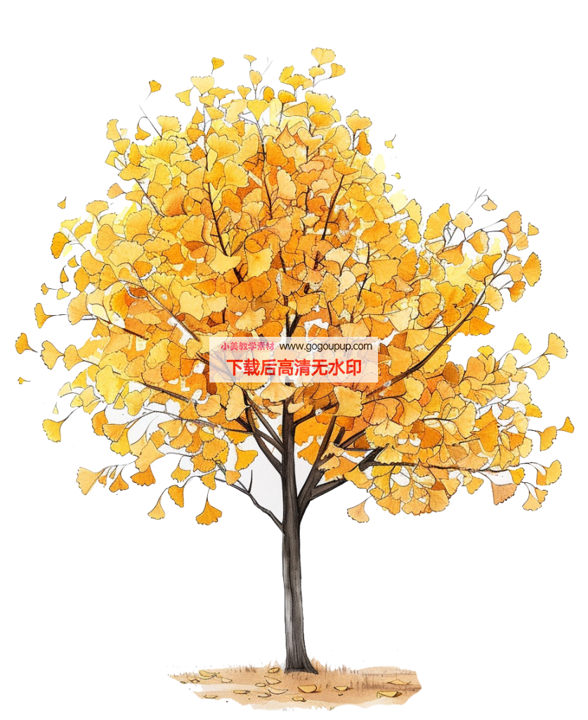这是一幅以银杏树为主题的手绘风格插画作品,完美捕捉了秋日的宁静与生机。作品采用​​绝对中心构图​​,将银杏树置于纯白背景中央,通过极简处理最大化突出主体的形态美感。银杏树造型生动细腻:​​深棕色树干​​笔直挺拔,纹理自然体现树木的苍劲;​​茂密的树冠​​由无数金黄色的扇形叶片组成,叶片层叠交错,部分飘落至浅棕色草地,增添动态韵律。色彩策略采用​​高饱和度暖色调​​(金黄/深棕/浅棕)与纯白背景的强烈对比,既突出秋季的浓郁氛围,又营造出清新明快的视觉体验。技法上通过​​手绘笔触​​勾勒细节,整体呈现​​自然和谐、充满季节感​​的艺术特质。