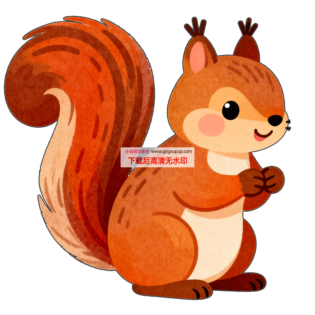 这是一幅温馨可爱的卡通风格松鼠插画作品。作品采用​​绝对中心构图​​,将松鼠形象置于纯黑色背景中央,通过极简处理最大化突出主体的视觉吸引力。松鼠造型生动传神:​​棕红色毛发​​通过明暗过渡呈现柔软质感,​​白色腹部​​形成色彩对比,​​红晕脸颊​​与​​圆睁的大眼睛​​增强萌系表情,​​微笑嘴角​​与​​交握的双手​​传递友好亲切感,​​蓬松上卷的大尾巴​​增添动态趣味。色彩策略采用​​暖色调主导​​(棕红/白)与纯黑背景的高对比度,通过简洁造型与细腻细节,成功营造出​​温暖治愈、活泼可爱​​的视觉氛围。