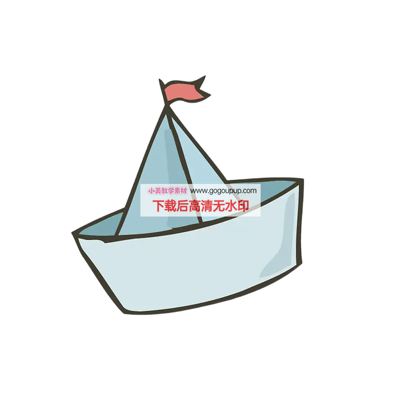 这是一幅充满童趣的手绘风格纸船插画作品。作品采用中心偏右构图,将纸船置于纯白背景中央,通过略微右倾的动态姿态营造出航行中的前进感。纸船造型简洁生动:浅蓝色船体呈圆润矩形,前端微微上翘,三角形帆与船体同色,边缘用黑色线条勾勒增强立体感,鲜红色小旗帜在帆顶飘扬,成为画面的色彩焦点。色彩策略采用高对比度配色(浅蓝/白/红),通过极简背景最大化突出主体,手绘笔触赋予画面清新自然、充满想象力的艺术氛围。整体通过几何化造型与符号化元素的结合,成功传递出简约治愈、扬帆远航的意境。