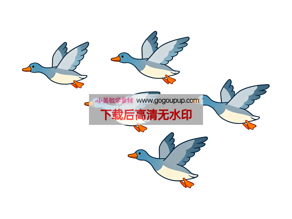 这是一幅主题明确、构图简洁的矢量卡通插画。作品的核心是五只形态一致的大雁,它们以经典的V字形队列飞行,生动地描绘了鸟类迁徙的典型场景。每只鸭子都具有鲜明的卡通特征:蓝色的头部与翅膀、白色的腹部、以及橙色的喙和脚,色彩搭配明亮活泼,形成了强烈的视觉吸引力。画面采用纯白色背景,最大限度地突出了鸭子的形态与队形,营造出简洁干净的视觉效果。V字构图不仅带来了动感与方向性,还巧妙地传达出团队协作、秩序与领导力的象征意义。整体画风轻松可爱,充满活力,非常适合用于表达团队、旅行、目标一致等主题。