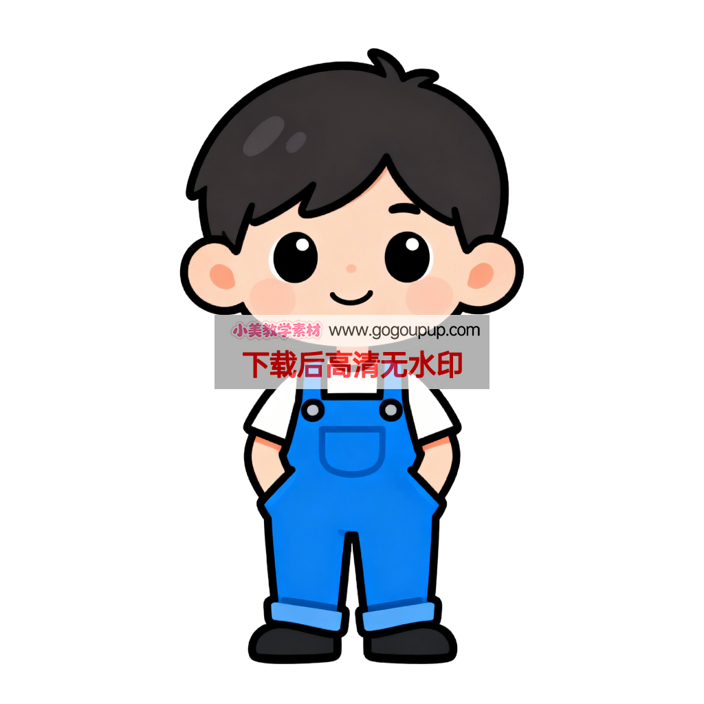 这是一幅典型的角色设计类卡通插画,塑造了一个性格鲜明的男孩形象。作品采用​​中心构图法​​,将主体置于纯白色背景前,最大化突出角色特征。人物造型呈现标准卡通比例:​​黑色刺猬头短发​​搭配​​圆形红晕脸颊​​,通过​​夸张的圆润大眼睛​​和​​咧嘴微笑​​的表情设计,传递出阳光活泼的个性。服装设计极具标志性——​​白色棉质短袖​​与​​亮蓝色背带裤​​形成清爽对比,​​双手插兜​​的姿势自然流露出轻松自信的状态。色彩策略采用​​高饱和度块面组合​​(黑发/红晕/白T/蓝裤),搭配​​粗轮廓线勾边​​的卡通绘制技法,使形象清晰醒目。整体画面传递出​​欢乐、童真、充满朝气​​的积极情绪,适合作为角色设计模板或儿童题材插画素材。