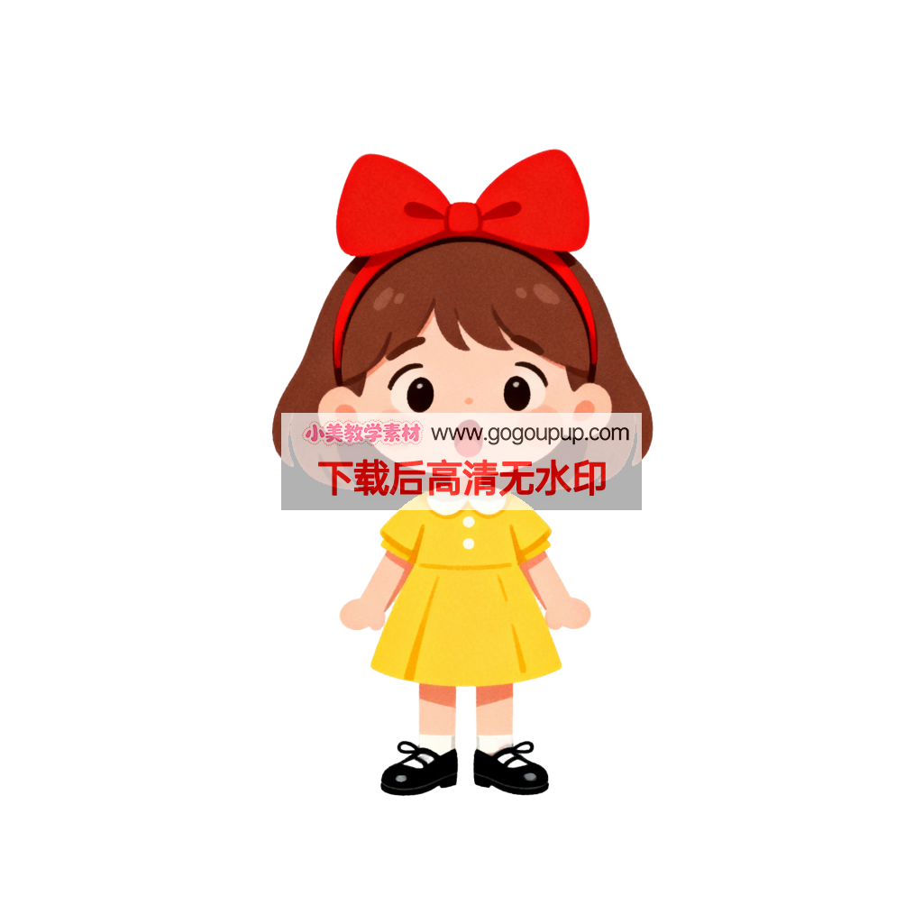 画面主体是一位身穿明黄色连衣裙、头戴红色蝴蝶结的卡通女孩,采用居中构图立于纯白色背景前,形象活泼可爱。人物造型突出卡通特征:棕色短发与红色大蝴蝶结形成鲜明对比,圆睁的双眼和团状红晕增强了角色俏皮感,黄色连衣裙与黑色小皮鞋构成经典配色。