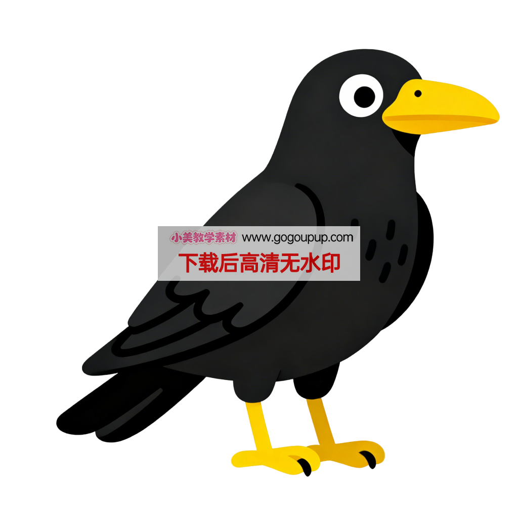 这是一幅充满幽默感的拟人化卡通乌鸦插画。画面采用侧面居中构图,乌鸦身体朝向右侧,头部呈15度扭转望向观众,形成互动感。角色设计突出卡通特质:蓬松的黑色羽毛通过简化轮廓表现,亮黄色鸟喙夸张放大并呈现张开状态,与橙色爪子形成色彩呼应。眼睛设计尤为传神——白色椭圆眼眶内嵌**黑色小圆瞳仁」,营造出呆萌好奇的表情。