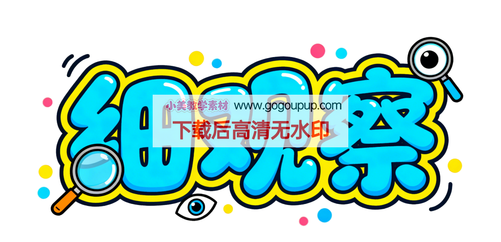 这是一幅以”培养观察力”为主题的教育启蒙类创意设计图。画面采用​​中心放射式构图​​,将核心标语”细观察”三个大字作为视觉焦点,每个汉字均运用​​蓝底黄边的立体卡通字体设计​​,通过明暗对比增强立体感。围绕文字精心布置了​​两个放大镜图案​​(左侧为黄柄蓝镜,右侧为蓝柄黄镜)和​​一只橙色卡通眼睛​​,形成观察工具的符号系统。背景散布的​​多彩圆点​​(红/黄/绿/蓝)既平衡了构图密度,又暗示观察发现的多样性乐趣。色彩策略采用​​高饱和度对比色​​(主色调蓝黄+点缀色),在纯白背景上形成强烈视觉吸引力。整体设计通过图形化语言将”细致观察”的抽象概念转化为直观视觉符号,兼具​​教育性、趣味性和视觉引导性​​。