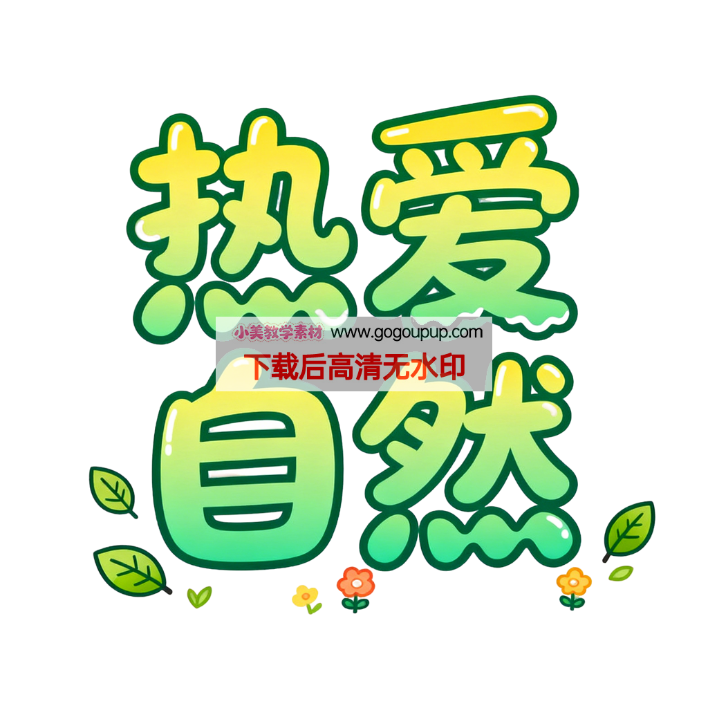这是一幅充满生机感的自然主题卡通艺术字设计。作品采用中心对称构图,将”热爱自然”四个大字作为视觉焦点,通过黄绿渐变色彩模拟植物新生的鲜活感,搭配深绿色描边增强立体效果。文字周围环绕嫩绿叶脉与小花图案,形成自然元素的视觉延伸。纯白背景最大化突出主体的清新特质,整体设计通过色彩语言与自然符号的有机结合,成功传递出蓬勃朝气、生态友好、清新明快的视觉意境。