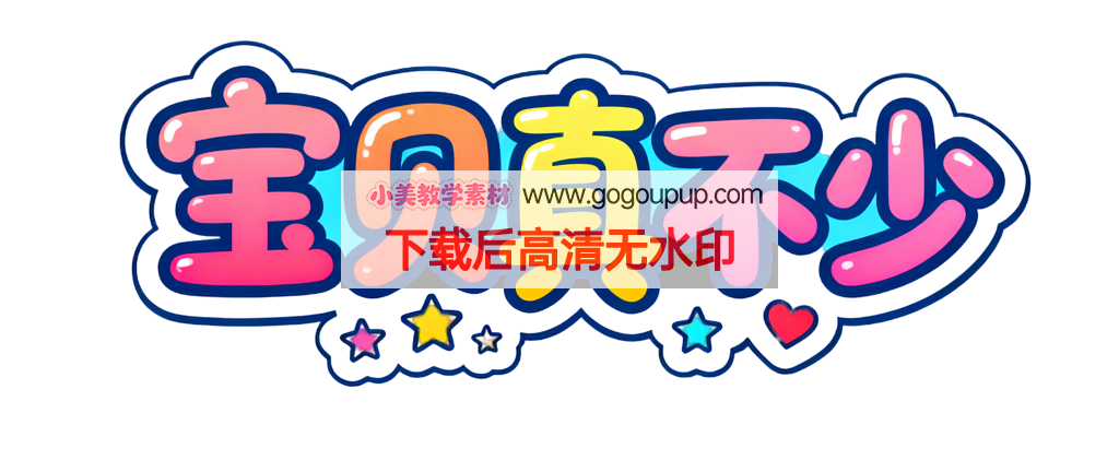 这是一幅充满童趣的卡通艺术字设计作品。画面采用水平居中构图,将”宝贝真不少”五个大字作为核心视觉元素。字体设计采用圆润饱满的胖胖体,每个字都配有亮蓝色描边增强立体感。色彩运用极具巧思——”宝不少”三字使用甜蜜粉色形成首尾呼应,”贝”字选用活泼橙色作为过渡,”真”字采用明快黄色担任色彩中枢,形成粉-橙-黄-粉的渐变节奏。