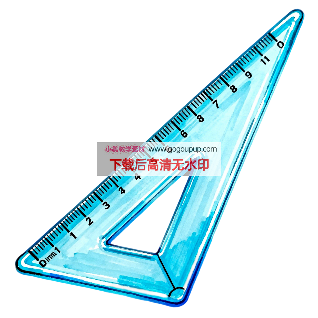这是一幅精确呈现绘图工具的教学类插画。作品采用仰视角度构图,以纯白背景突出蓝色三角尺的立体形态。三角尺为透明蓝色塑料材质,呈现标准的直角等腰三角形造型,两条直角边清晰标注0-11厘米的毫米刻度,斜边保留无数字的刻度线。中心处的同形镂空设计既减轻重量又便于抓握,左下角”0mm1″与右上角”0″的标注构成精准的测量起点。插画通过手绘风格精准还原工具的每个细节,包括尺子的厚度和透明质感,完美结合了教学准确性与视觉美感,成为理想的数学或美术教育素材。
