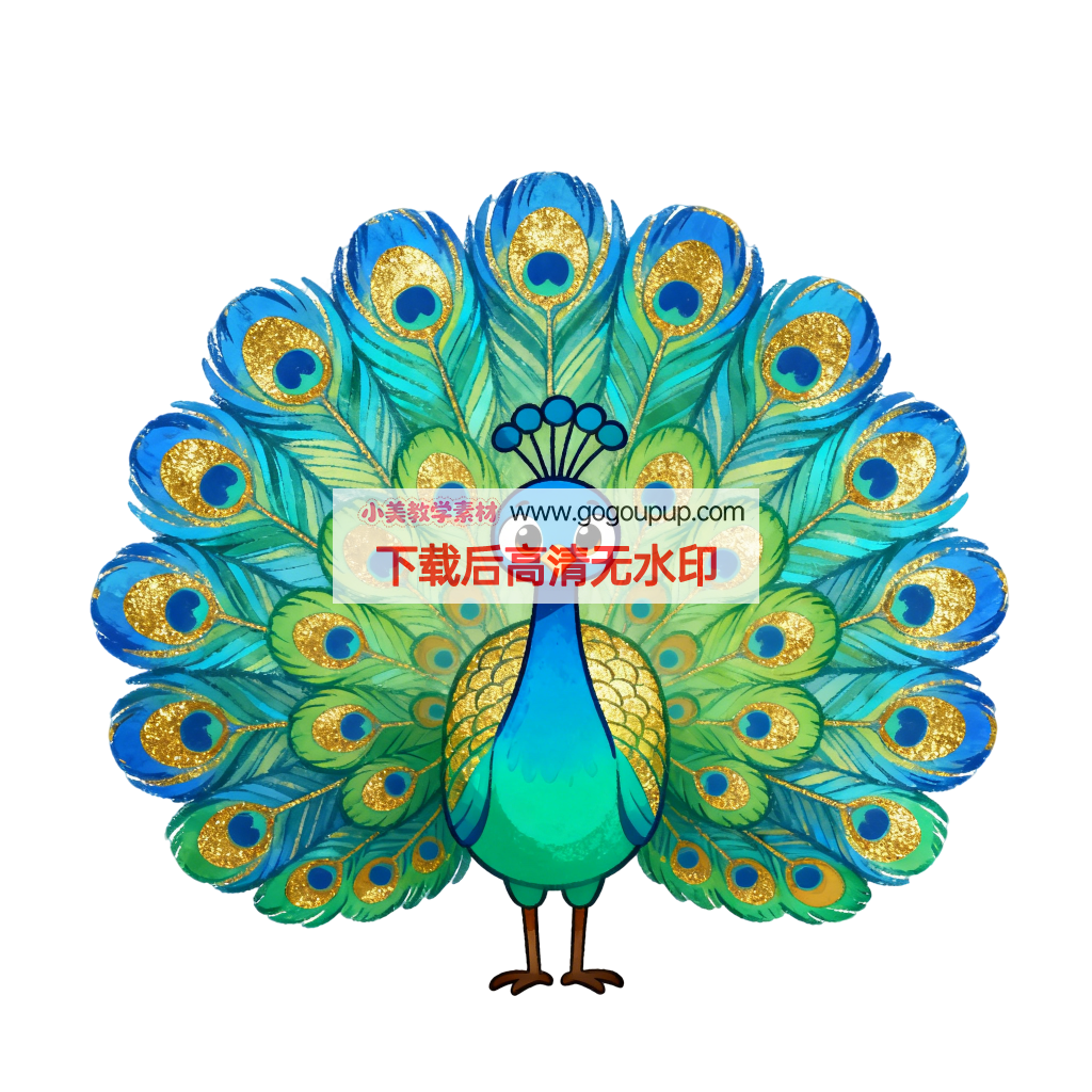 这是一幅极具视觉冲击力的华丽卡通孔雀插画。作品采用绝对对称式构图,将开屏的孔雀置于纯黑背景中央,最大化凸显主体的绚丽色彩。孔雀造型经过高度艺术化处理:宝蓝色身体与翡翠绿尾羽形成冷暖色调的完美碰撞,尾羽末端的金色环状花纹如同无数只眼睛,在深邃背景中产生神秘的闪光效果。头部设计精致可爱,白色羽冠与橙色鸟喙点缀其间,圆润的头部与灵动的眼睛赋予角色生命力。插画通过高饱和度配色和装饰性线条的运用,将孔雀开屏的华丽感转化为具有现代感的卡通语言,整体呈现出奢华、神秘、充满生命力的视觉盛宴。