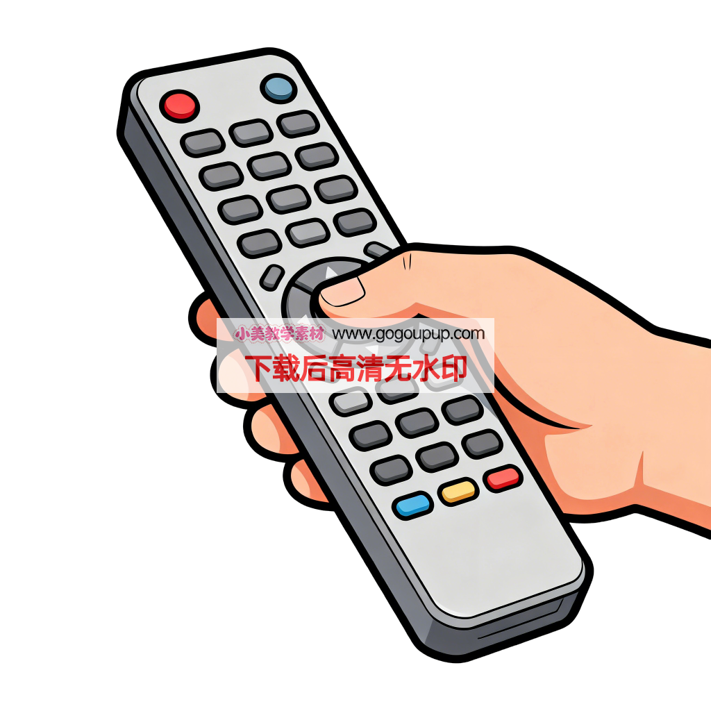 这是一幅功能指示明确的卡通风格交互场景插画。作品采用中心构图法,以写实手法描绘一只右手握持灰色遥控器的动态场景,背景留白处理凸显主体。遥控器设计呈现高度细节化:浅灰色机身分布着12颗黑色方形按键,顶部设有红蓝圆形功能键,底部配备红黄蓝三颗小型按键,按键布局符合人体工学。手部刻画精准,自然握持姿势展现使用状态,拇指悬于按键上方暗示交互瞬间。机身标注的”VOLX”标识可能暗示音量控制功能。色彩运用采用中性灰主调,通过高饱和度的红黄蓝点缀键形成视觉焦点,整体呈现科技感、实用性与卡通趣味性的完美融合。