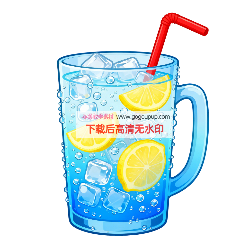 这是一幅细节丰富的主题卡通插画,生动呈现了快餐连锁店的饮料销售场景。画面采用信息分层构图,中心位置突出展示一杯充满气泡的蓝色冰饮,杯身凝结的水珠和黄色柠檬片强化清凉感。