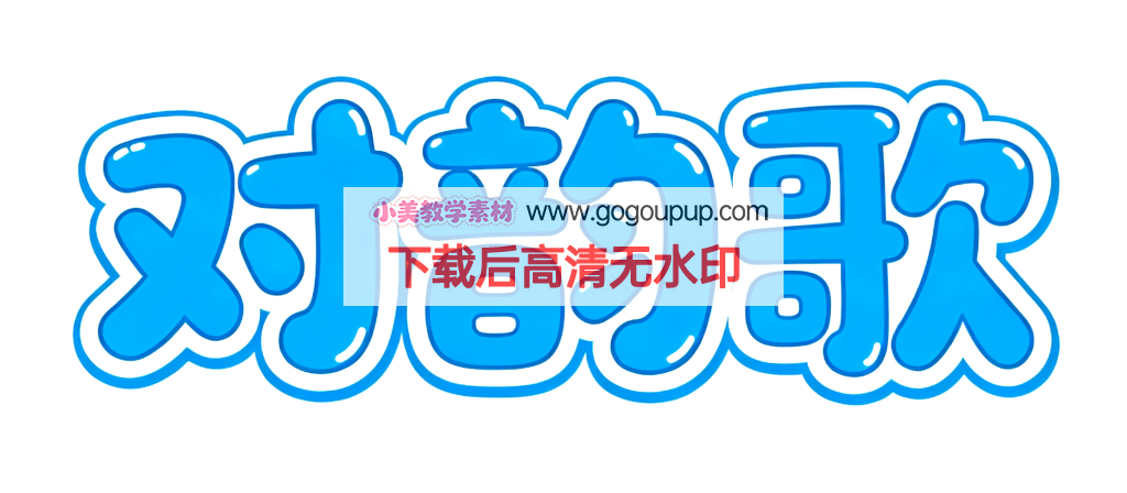 这是一幅充满童趣的汉字启蒙教育主题设计作品。画面采用​​绝对中心构图​​,将”对韵歌”三个汉字作为核心视觉元素居中排列,通过严谨的对称布局营造稳定感。字体设计极具特色:采用​​圆润饱满的卡通字体​​,每个笔画都呈现​​立体光泽效果​​,通过高明度的​​蓝色渐变填充​​模拟立体感,边缘添加​​白色描边​​增强辨识度。色彩策略简洁有力,​​纯净的白色背景​​与​​明亮蓝色字体​​形成鲜明对比,既保持画面清爽又突出教育主题。整体设计通过​​儿童友好的视觉语言​​,将传统启蒙教材转化为具有现代感的卡通表现形式,呈现出​​活泼明朗、寓教于乐​​的视觉风格。