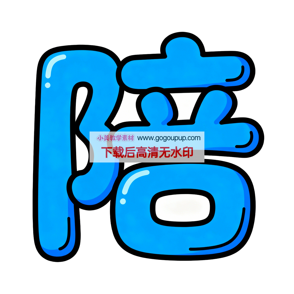 这是一幅简洁明快的卡通风格单字设计作品。画面采用​​绝对中心构图​​,将汉字”陪”作为唯一视觉元素置于纯白背景中央,形成强烈的视觉聚焦效果。字体设计采用​​饱满的蓝色填充​​,搭配​​黑色轮廓描边​​增强识别度,关键笔画处添加​​白色高光效果​​塑造立体质感。色彩运用高度凝练,通过​​蓝、黑、白​​三色对比营造出清爽活泼的视觉风格。整体设计既保留汉字的可读性,又通过卡通化处理赋予文字情感温度,呈现​​温暖治愈、现代简约​​的美学特征。