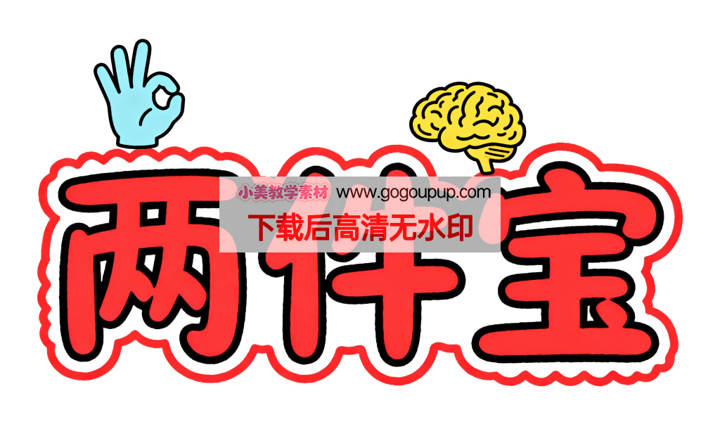 这是一幅富有教育寓意的创意卡通设计作品。画面采用​​黄金三角构图​​,通过”OK手势-文字-大脑图案”三个视觉元素形成平衡结构。主体文字”两件宝”采用​​火焰形轮廓设计​​,红色填充配合黑白双色描边增强立体感,波浪形外轮廓赋予文字灵动气息。色彩策略运用​​三原色对比原理​​:红色文字作为视觉重心,与左侧​​浅蓝色OK手势​​(象征动手能力)和右侧​​黄色大脑图案​​(象征思考能力)形成色彩闭环。图形与文字的语义关联巧妙点明”手脑并用”的教育理念,纯白背景强化了元素的聚焦性。整体设计通过​​符号化视觉语言​​将抽象教育理念转化为直观认知符号。