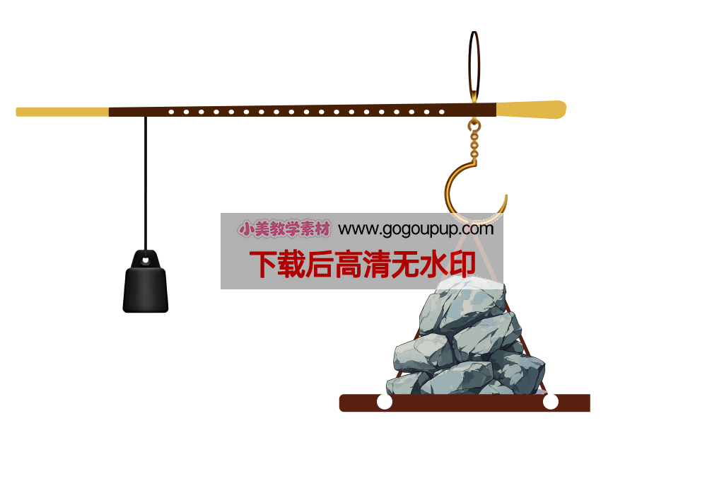 这是一幅呈现物理平衡原理的简易称重装置示意图。作品采用水平对称构图,棕色杠杆横向贯穿画面中央,两端悬挂的黑色秤砣与灰色岩石形成力学对比。杠杆设计蕴含科学细节:精确分布的白色刻度点体现测量功能,黄色端头增强视觉识别度,金色挂钩作为连接部件展现机械美感。色彩采用沉稳的实用色系(棕/黑/灰/金),纯白背景凸显装置结构。