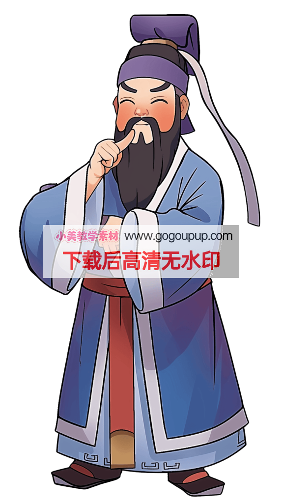 这是一幅具有传统美学特征的卡通风格中国古代人物画像。作品采用中心对称构图,将人物置于纯白背景中央,通过极简处理强化主体表现力。人物塑造融合历史元素与艺术夸张:长及胸口的黑色胡须体现年长智者的形象特征,紫色高冠与蓝色交领长袍呈现古代服饰的等级色彩,红色腰带形成点睛之笔。人物动态设计颇具深意——右手食指轻触嘴唇的动作配合微含笑意的眼神,营造出欲言又止的生动情态,左手抱臂的姿势更显从容气度。色彩运用采用高饱和度传统色系(紫/蓝/红),通过平面化色块处理展现卡通设计的现代感,整体传递出智慧内敛、亲和而不失威严的视觉叙事。