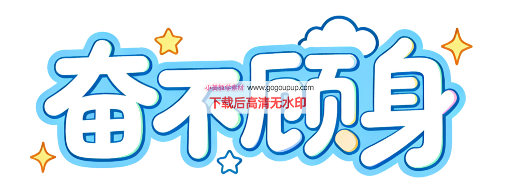 这是一幅充满正能量的励志主题艺术字设计作品。画面采用水平居中构图,将”奋不顾身”四个大字作为视觉焦点,通过卡通化立体设计呈现强烈的视觉张力。字体设计极具特色:饱满的粗体字形采用纯白填充搭配亮蓝色粗描边,边缘添加淡黄与粉红的渐变高光塑造出晶莹剔透的质感。装饰元素精心布置——左上角大尺寸黄色星星与右侧三颗小星星形成节奏感,既平衡构图又象征奋斗精神。色彩策略采用高对比度方案(蓝/白/黄),在纯白背景上形成明快活泼的视觉效果,整体传递出勇往直前、积极向上的精神内核。