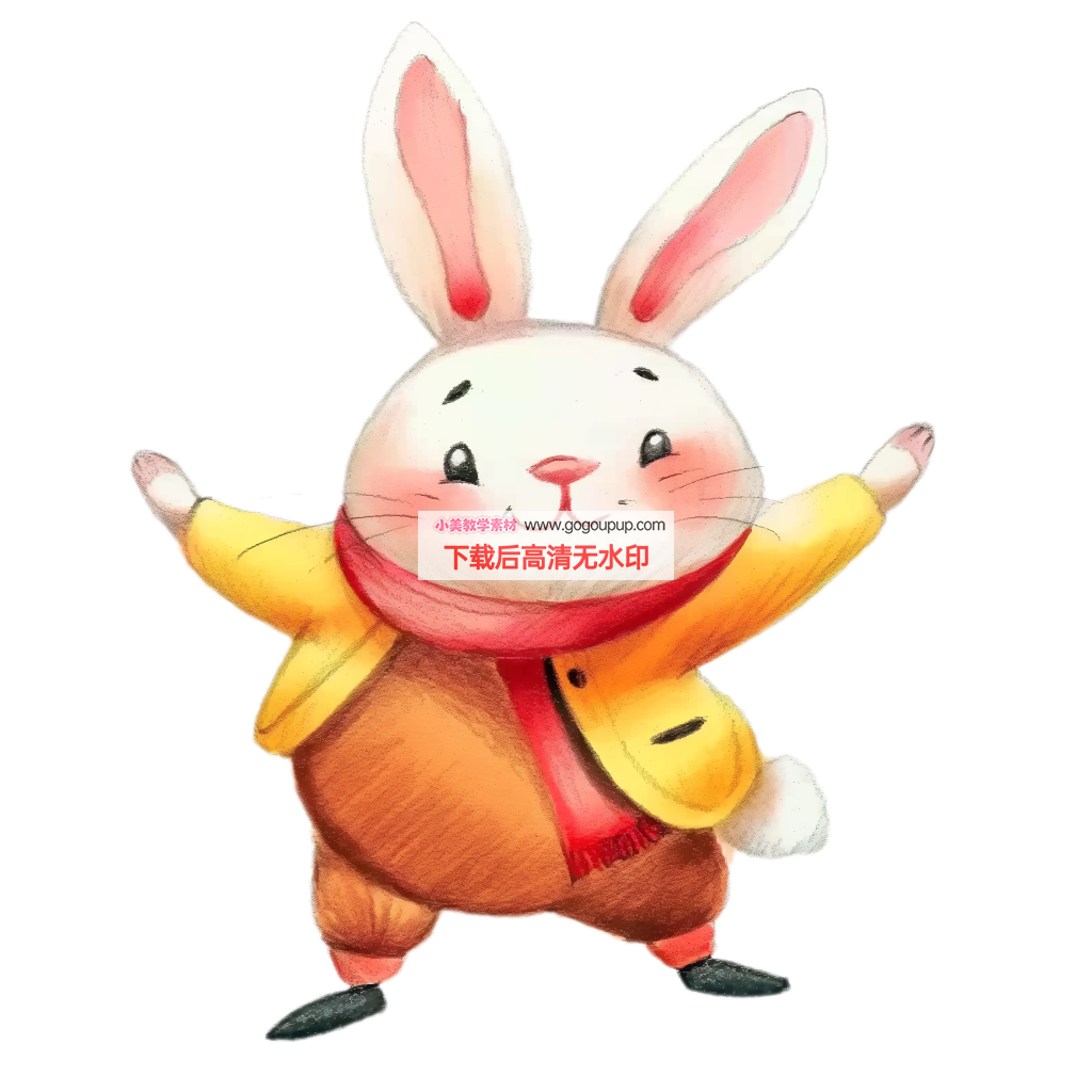 这是一幅充满温暖治愈感的拟人化卡通兔子形象设计。作品采用绝对中心构图,将兔子形象置于纯白背景中央,最大化突出主体的亲和力。角色设计融合时尚元素与萌系审美:白色毛绒质感的面部与耳朵呈现柔软触感,粉色圆形腮红与上扬的嘴角构成灿烂微笑,黄色外套与红色围巾的撞色搭配展现活泼个性。动态设计尤为出色——张开的双臂形成拥抱姿态,传递出开放与欢迎的情感暗示。色彩策略采用高饱和度暖色调(白/黄/红/棕),通过明快的色块对比营造欢快、温馨、充满活力的视觉叙事。