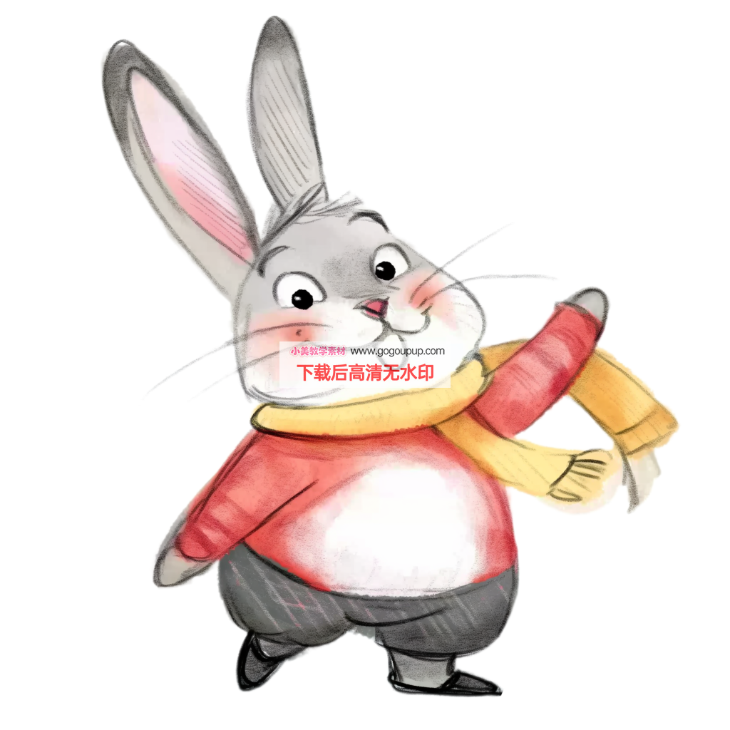 这是一幅活泼可爱的拟人化兔子角色插画。作品采用​​中心对称构图​​,将跳舞的兔子置于纯白背景中央,最大化突出主体形象。角色设计充满动态感:​​灰白色兔身​​搭配​​红色上衣​​与​​深色裤子​​形成鲜明对比,​​黄色围巾​​随动作飘扬增强动势,​​吐舌俏皮表情​​与​​抬起的手臂​​完美捕捉舞蹈瞬间。画面中包含”湯姆”和”小猪佩奇”文字元素,可能暗示角色命名或主题关联。色彩采用​​高饱和度搭配​​(红/黄/灰),通过简洁的平面化处理展现卡通特有的明快风格,整体呈现​​欢乐活泼、充满童趣​​的视觉叙事。