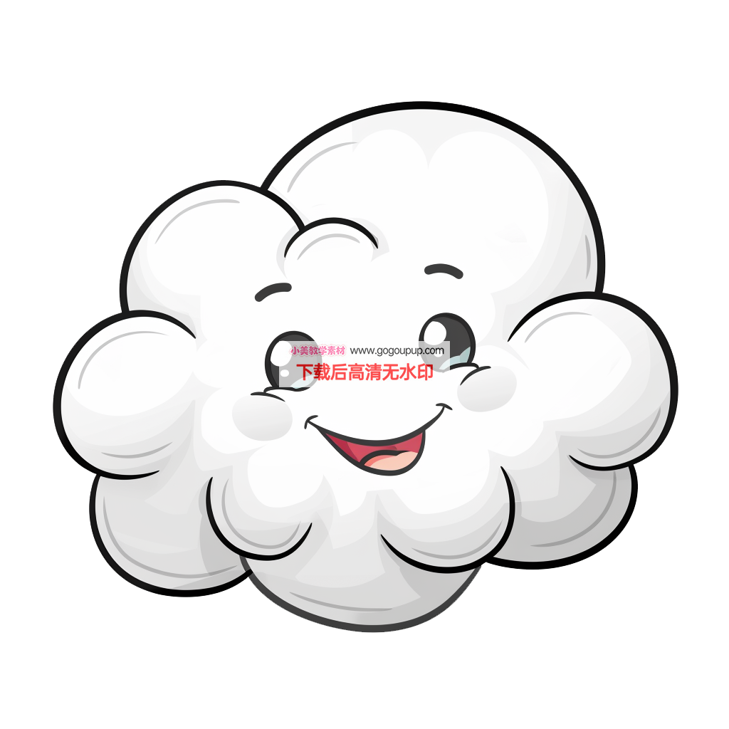 这是一幅充满治愈感的拟人化云朵主题卡通插画。作品采用​​绝对中心构图​​,将白云角色置于纯白背景中央,通过留白艺术强化主体表现力。角色设计生动传神:​​圆润蓬松的云朵造型​​通过柔和的边缘曲线呈现轻盈质感,​​黑色轮廓线​​精准勾勒形态的同时保持视觉整洁。面部特征尤为突出——​​椭圆形大眼睛​​中的高光点赋予灵动神采,​​夸张的咧嘴笑容​​与​​洁白牙齿​​展现无忧无虑的情绪,整体传递出强烈的亲和力。