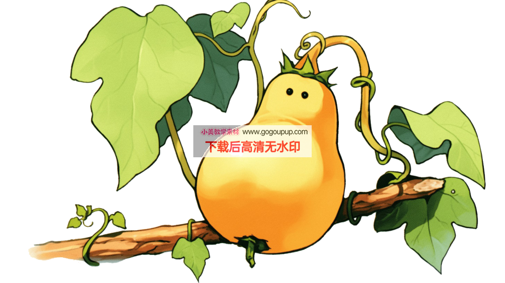 这是一幅充满自然趣味的拟人化植物主题卡通插画。作品采用中心聚焦式构图,将拟人化的葫芦作为视觉焦点悬挂于藤蔓中央,通过留白手法强化主体表现力。葫芦造型生动可爱:明黄色葫芦主体通过圆润曲线呈现饱满质感,黑色圆点眼睛与上扬的弧形嘴巴构成憨态可掬的表情。藤蔓设计自然灵动——棕色藤枝呈螺旋状缠绕,大小不一的绿叶通过深浅色彩变化展现层次感,部分叶片的缺口边缘增添真实自然气息。色彩策略采用高饱和度自然色调(黄/绿/棕),在纯白背景上形成鲜明对比,整体呈现生机盎然、清新治愈的视觉风格。