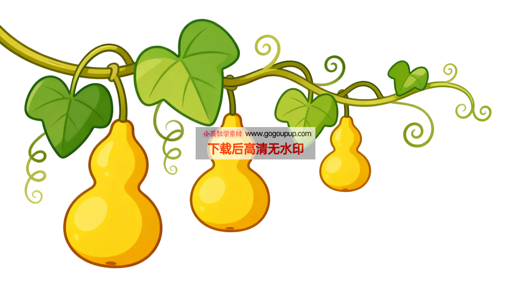这是一幅充满自然趣味的卡通风格植物插画。作品采用水平均衡构图,三根饱满的黄色葫芦沿藤蔓自然分布,形成稳定的视觉节奏。葫芦造型圆润可爱:明黄色主体通过深浅色块过渡呈现立体感,褐色蒂头细节增添真实感。藤蔓设计生动灵动——嫩绿色主藤呈舒缓曲线,心形绿叶的清晰叶脉与卷曲藤须赋予画面生机。色彩策略采用高饱和度自然色调(黄/绿/褐),在纯白背景上形成鲜明对比,整体营造活泼清新、充满田园趣味的视觉叙事。
