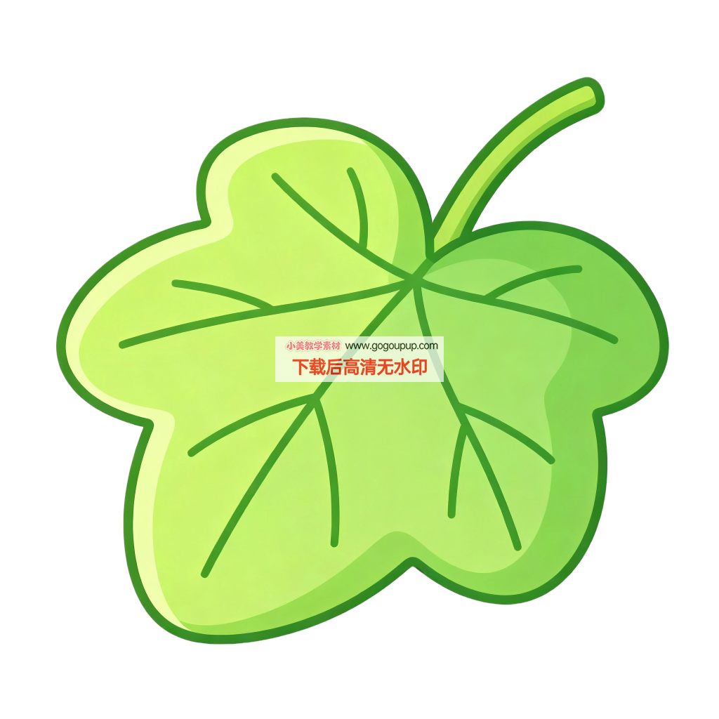 这是一幅风格清新、造型简洁的卡通植物叶片插画。作品采用绝对中心构图,将一片完整的绿色叶片置于纯白背景中央,形成强烈的视觉聚焦效果。叶片造型精准呈现植物特征:四裂掌状形态边缘圆润饱满,清晰的放射状叶脉从中心叶柄自然延伸至叶尖,展现自然的生长结构。技法上运用柔和的光影处理,通过明暗过渡赋予叶片立体感和柔和的体积感。色彩策略采用不同明度的绿色渐变,既保持统一的色调又呈现丰富的层次变化。整体通过简化细节和流畅线条的结合,成功营造出自然清新、充满生命力的视觉意象。