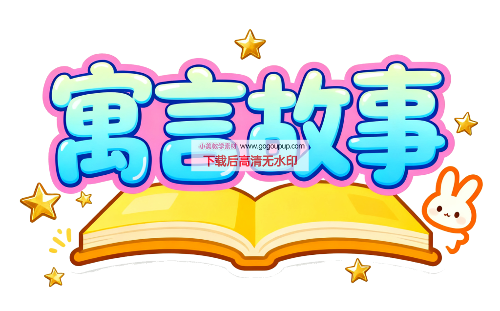 这是一幅充满童趣的寓言故事主题插画作品。画面采用​​中心对称构图​​,将一本打开的黄色书籍作为视觉焦点,上方搭配渐变蓝色的”寓言故事”艺术字,整体布局平衡和谐。色彩运用明亮活泼,​​黄色书籍​​与​​蓝色文字​​形成冷暖对比,​​粉色描边​​为画面增添柔和感。右侧的​​白色小兔子​​形象生动可爱,脸颊的粉红晕染和灵动表情赋予角色生命力,周围散布的​​金色星星​​进一步强化了梦幻氛围。纯白背景使主体元素更加突出,整体风格简洁清新,完美融合了阅读的趣味性与寓言故事的想象力。