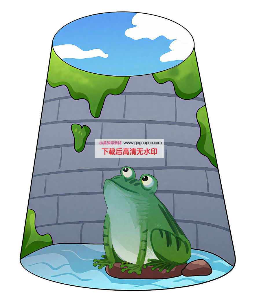 这是一幅充满寓言色彩的卡通风格场景插画,生动呈现了”井底之蛙”的经典意象。作品采用框景式构图,通过圆形井口形成天然画框,巧妙构建出仰视视角的独特观感。画面层次分明:井底绿色青蛙作为视觉焦点蹲坐在石头上,圆睁向上的双眼精准传达出好奇与局限的双重情绪;灰色砖块垒成的井壁通过深浅变化表现质感,点缀的绿色苔藓增添自然生机;井口外蓝天白云的明亮开阔与井内形成强烈对比。色彩运用高饱和度配色(青蛙的翠绿/井壁的灰褐/天空的蔚蓝),通过明暗对比强化空间纵深感,完美诠释了局限与自由的哲学隐喻。