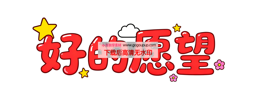 这是一幅设计感十足的卡通风格艺术字作品,以“好的愿望”为核心主题。字体设计圆润饱满,采用鲜艳的红色填充并带有光泽感,凸显活泼可爱的气质。装饰元素精心布置:文字上方配有一朵白色云朵,左侧点缀一颗黄色星星,右侧则有一颗黄色星星和两朵粉色小花,所有元素在纯白色背景的衬托下更加醒目。构图简洁明了,色彩对比鲜明,通过高饱和度的搭配成功营造出温馨、充满希望的整体氛围。