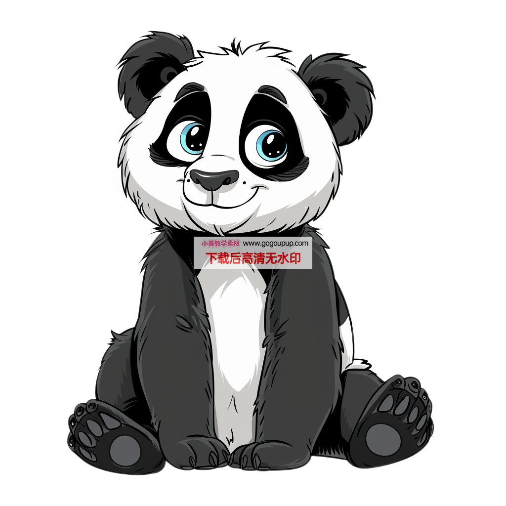 这是一幅极具感染力的卡通熊猫插画。作品采用​​绝对中心构图​​,将熊猫形象置于纯白背景中央,最大化突出主体的视觉吸引力。熊猫造型生动传神:​​圆润的黑白毛色分布​​精准还原物种特征,​​夸张的蓝色大眼睛​​与​​上扬的嘴角​​构成憨态可掬的微笑表情,​​毛绒质感​​的爪部细节增强画面温度。色彩策略采用​​高对比度配色​​(黑/白/蓝),通过极简背景强化主体表现力,整体呈现​​温暖治愈、萌趣十足​​的视觉叙事。图中字母”w”可能作为装饰元素存在。